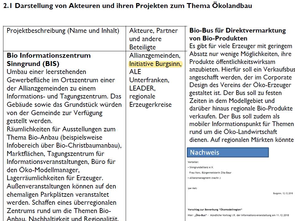 Beide Themenvorschläge versuchen nicht nur in Burgsinn eine Versorgungslücke zu schließen. Der Wegfall des Diska-Marktes trifft den Ortskern und alle dort fußläufig einkaufende Sinngründer schwer. Insbesondere für ältere Menschen war dies ein günstiger Anlaufpunkt für alltägliche Einkäufe. Mit dem BIS wollten wir den Leerstand mit Fördermittel (LEADER/Allianz) umwandeln. Mit einem kleinen Erzeugermarkt hätten Bio-Erzeuger ihre Produkte vermarkten und lagern können. So wäre auch die Nahversorgungslücke bei einzelnen Erzeugnissen geschlossen worden. Und auch ausreichend Platz für das Management der Modellregion mit Schulungsräumen (Kooperation FOS/BOS) und Lehr-/Infotafeln rund um das Thema "Bio" für Interessierte und touristische Gäste wäre vorhanden gewesen. Auch Aktionen in der Vorweihnachtszeit rund um den zentralen Verkauf von Bio-Christbäumen wären denkbar gewesen.